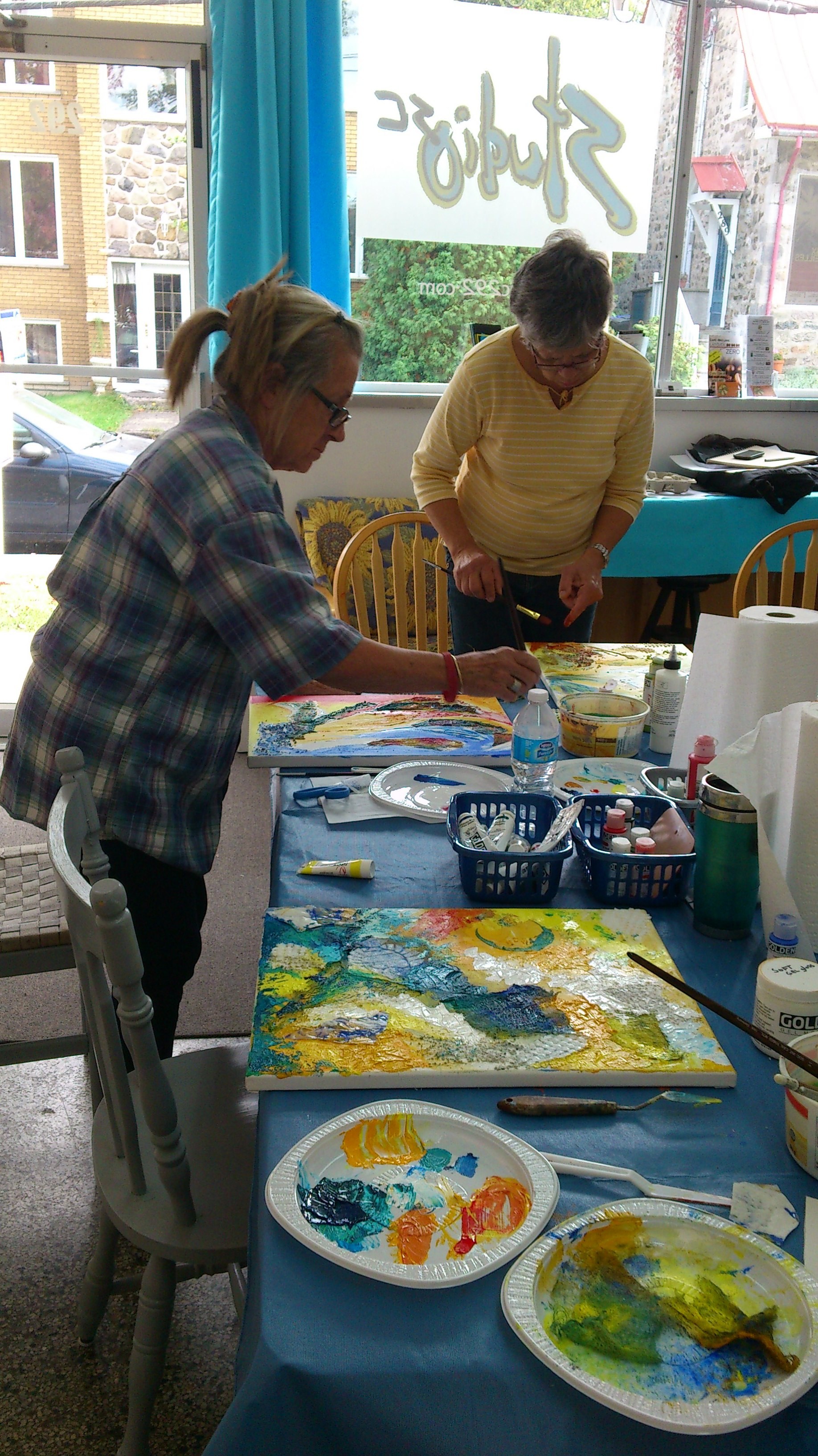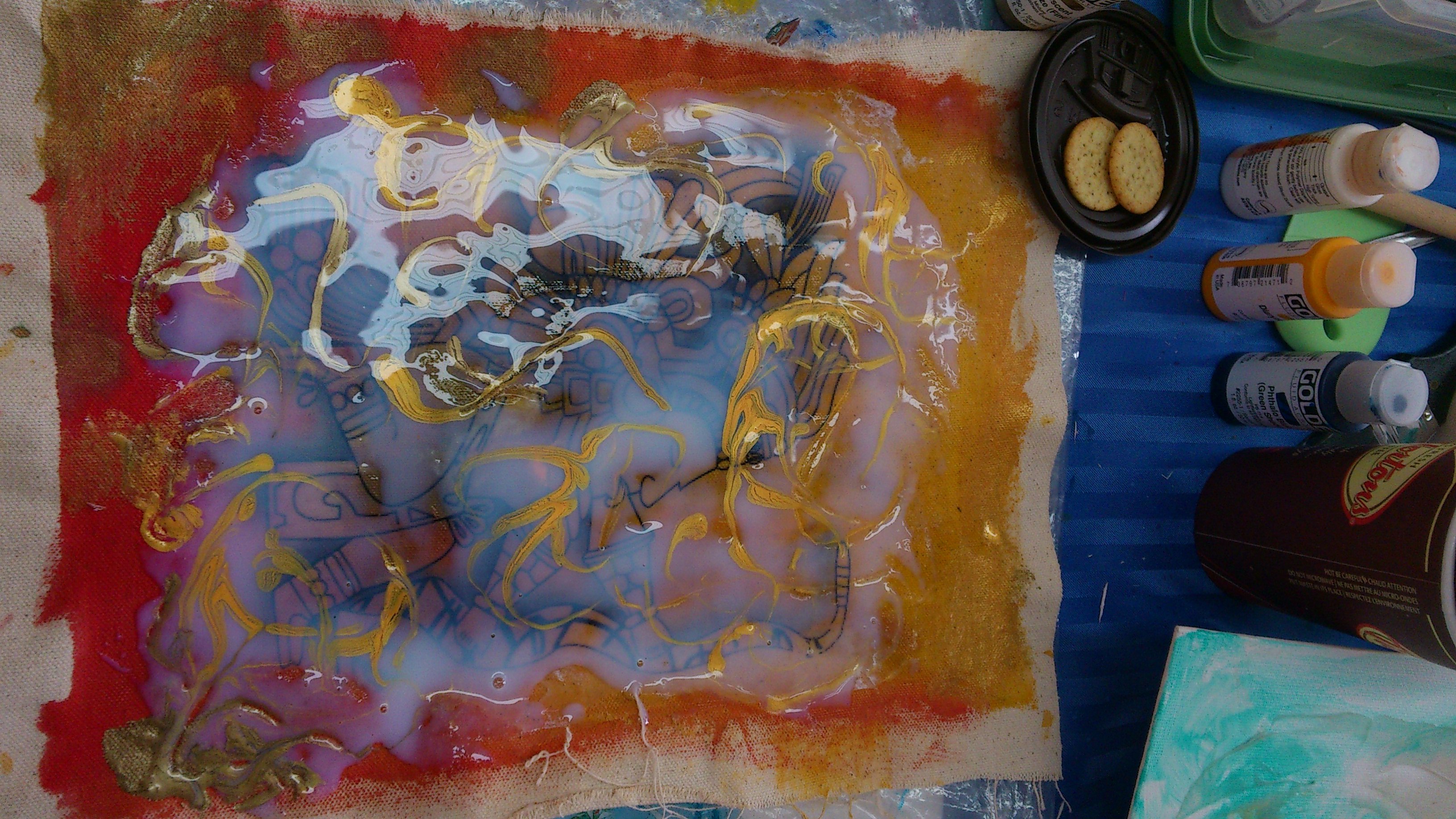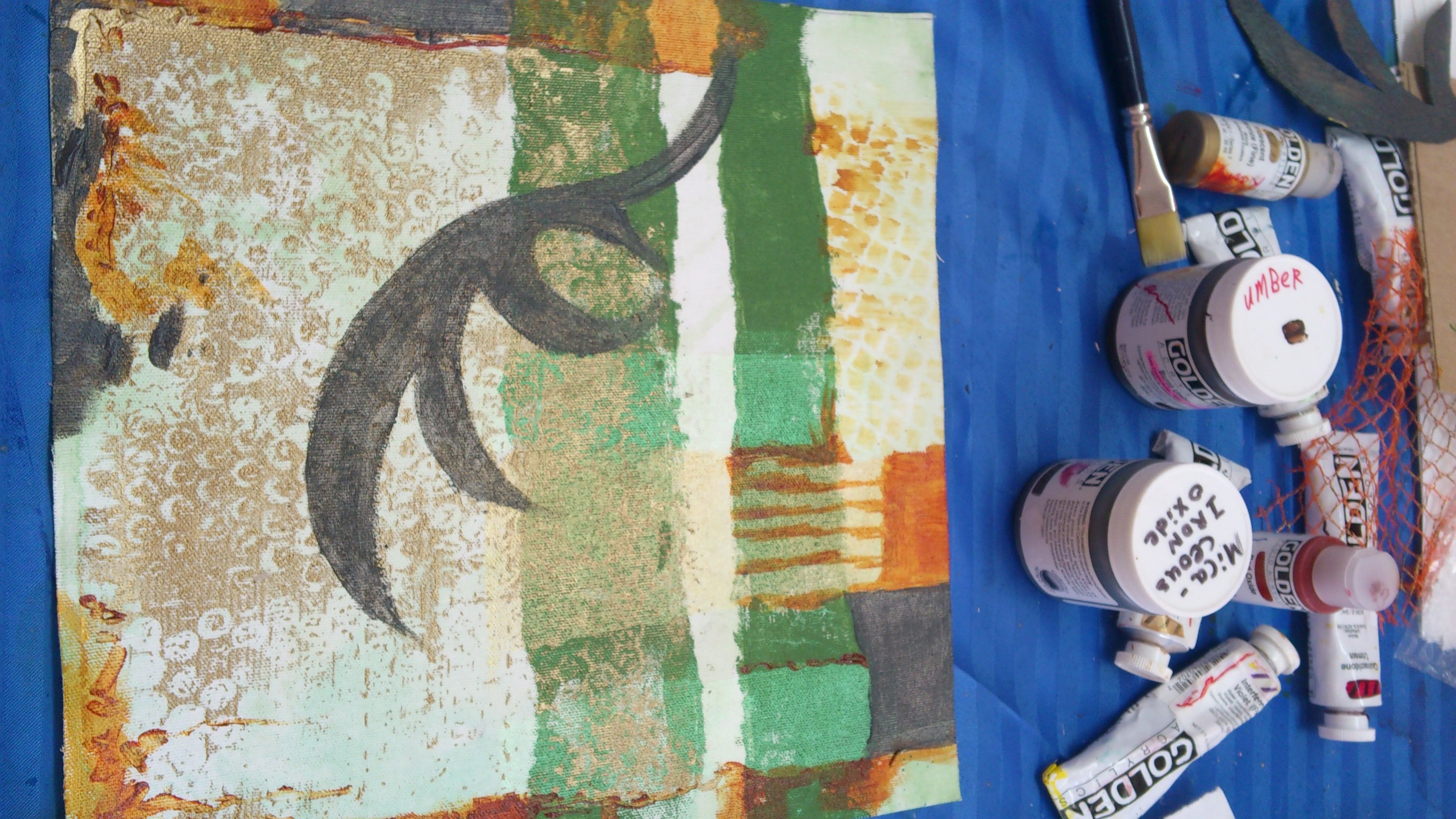Nous avons utilisés les différentes pâtes Golden, les Gels et la peinture Golden. Des transferts d’images ainsi que quelques pochoirs ont été utilisés, un travail dans le Clear Tar Gel a été bien apprécié. La confection de différentes peaux en gel et pâtes a été un peu plus laborieuse. Il faut dire que la journée a été très chargé.
