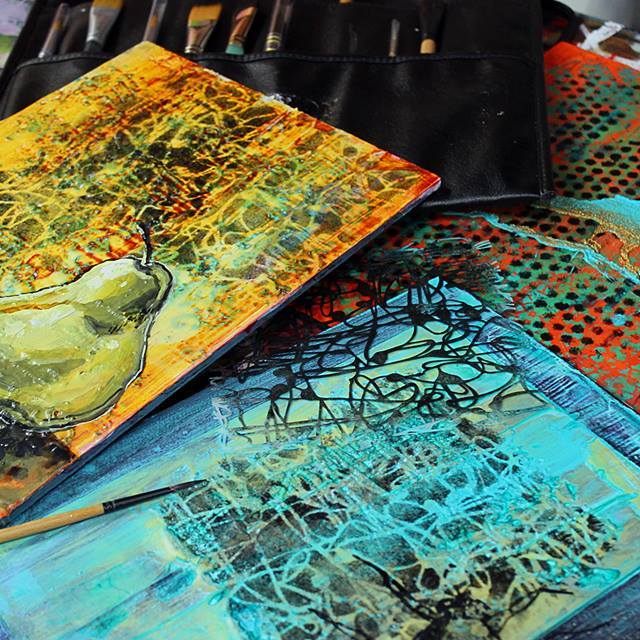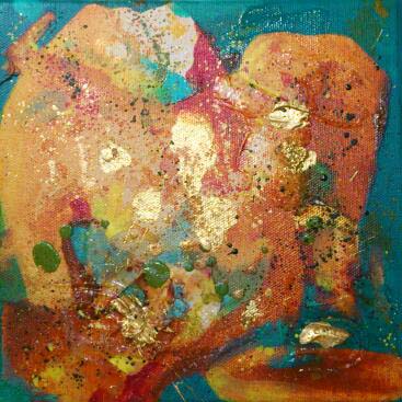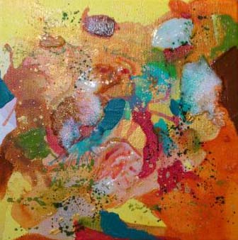 Paysage abstrait, Lumiere au crepuscule 10x10po , techniques mixtes, filet pate, gel, acrylique medium.