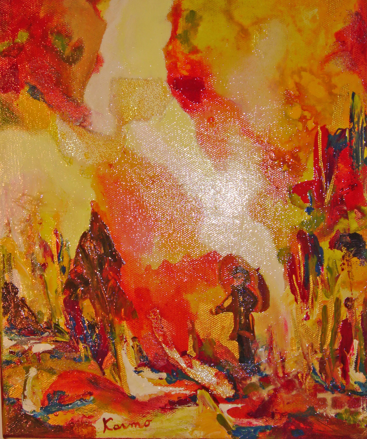 Sur le chemin, 10x12po. Techniques mixtes, acrylique, gel billes de verres, medium