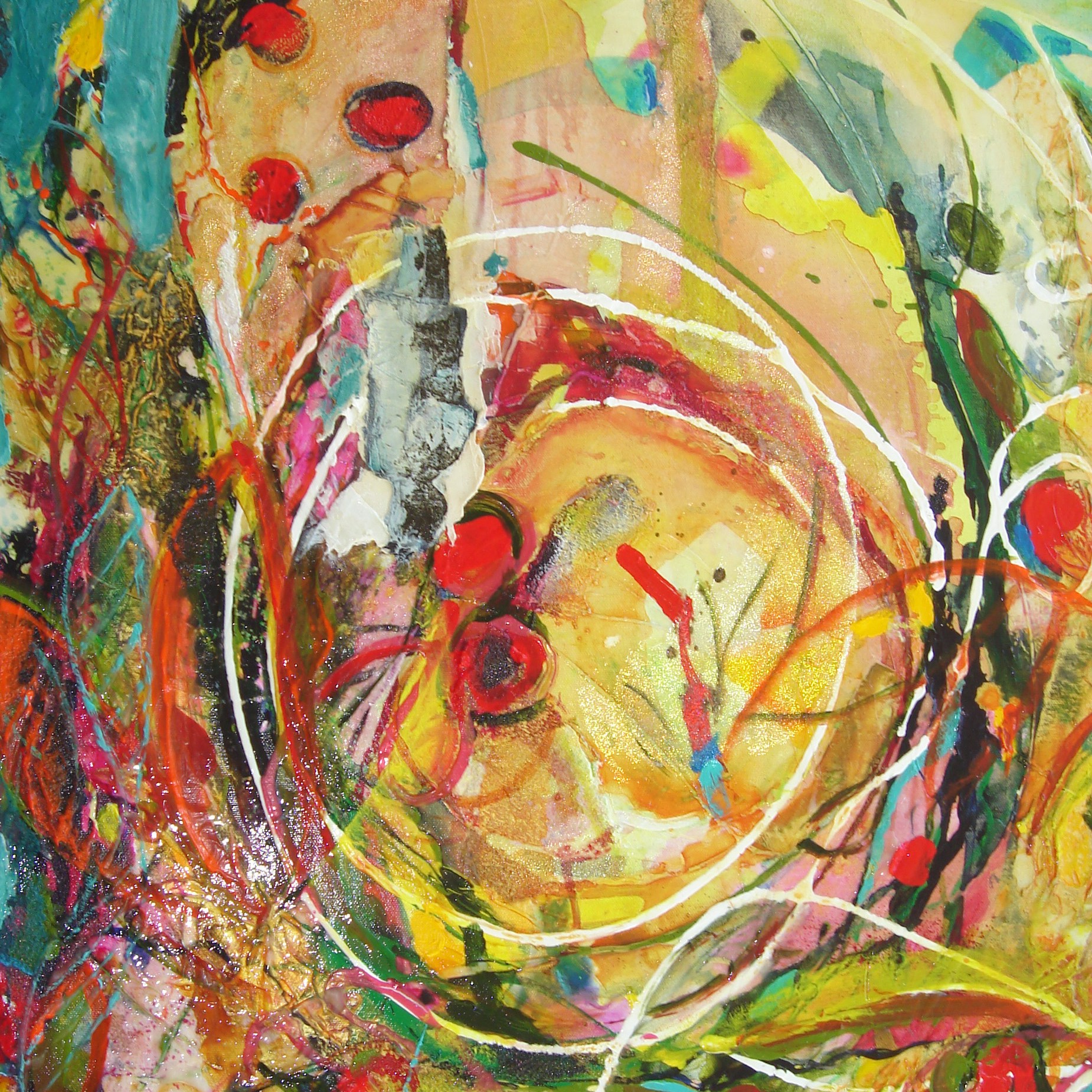Paysage abstrait – Joie, 10×10 po. Techniques mixtes, corde, filet, acrylique, gel medium